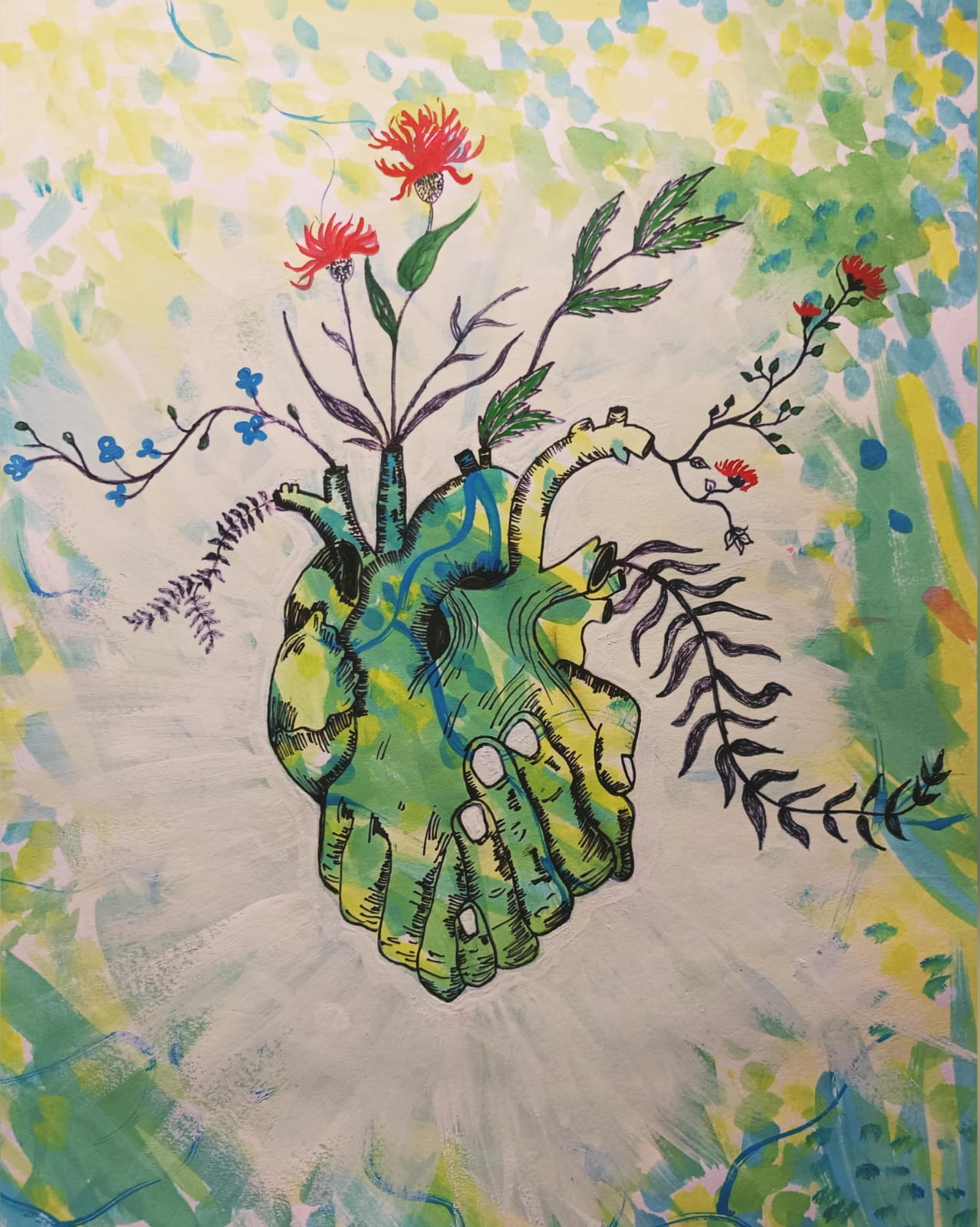One day, the clouds parted ways, and there was a subtle flicker of a butterfly. As I felt courage to paint my experience and emotions in a form of a painting using my finger tips, a small part of me was re-discovered. I started painting and drawing with no formal education in arts and with no prior experience.